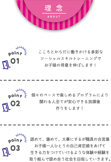 | サービス提供時間 | 児童発達支援 【 午前クラス 】 平 日 10時30分~12時 休校日 10時~11時30分 【 午後クラス 】 平 日 14時~17時 休校日 13時30分~16時30分 【 土曜クラス 】 土曜日 10時30分~16時30分 放課後等デイサービス 【 午後クラス 】 平 日 14時~17時 休校日 13時30分~16時30分 【 土曜クラス 】 土曜日 10時30分~16時30分 |